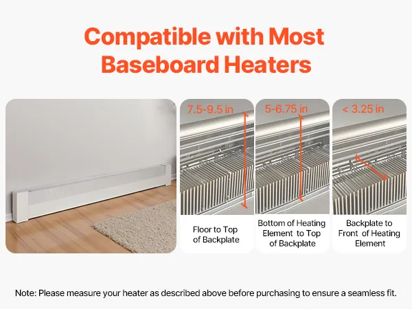 This baseboard heater cover is designed to fit various common heater sizes. Important Note: Measure your heater before purchase to ensure a ideal fit.