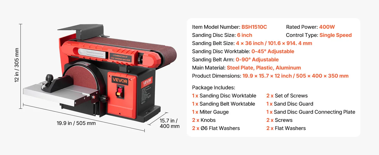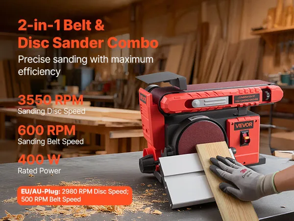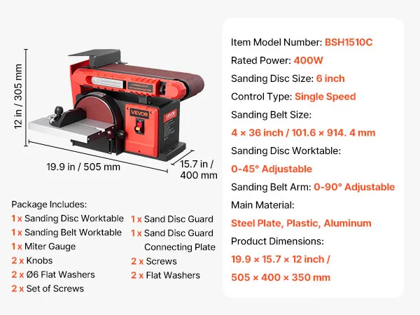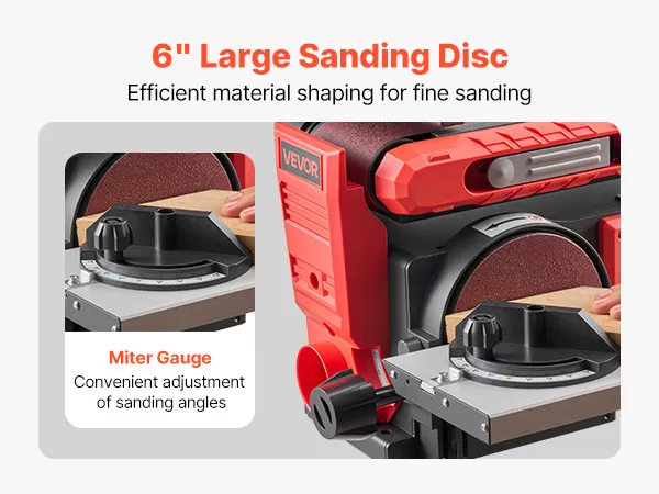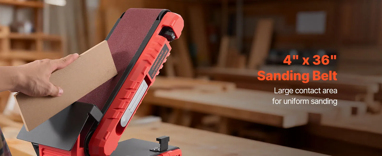 Achieve smooth sanding results with our 6" disc & 4" x 36" belt sander combo. Powered by a 400W motor, it features a 0–90° adjustable belt and 0–45° tilting disc worktable for precise angle sanding. Ideal for shaping, smoothing, and refinishing wood, furniture, and DIY project efficiently.