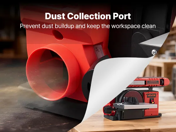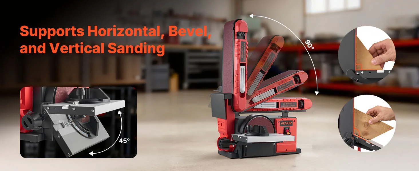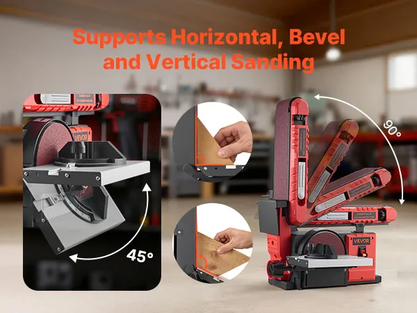0-45° tilting disc worktable and 0-90° adjustable sanding belt allow you to set the ideal angle, offering great flexibility for sanding different workpiece shapes and contours.