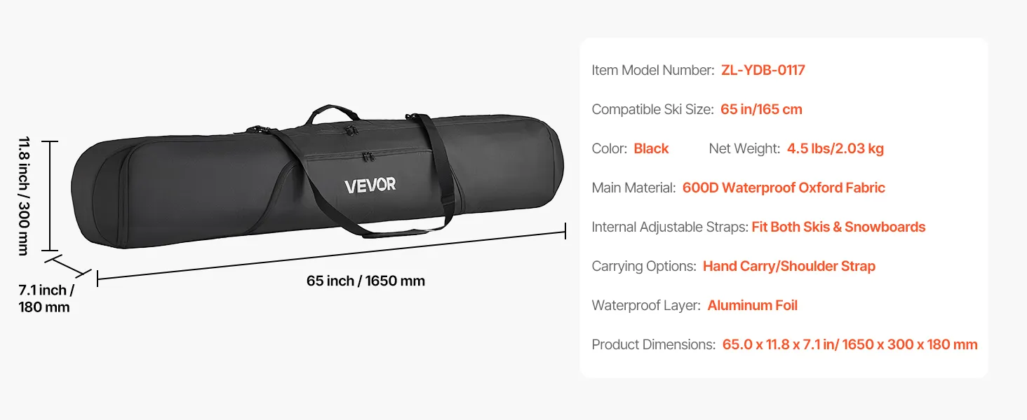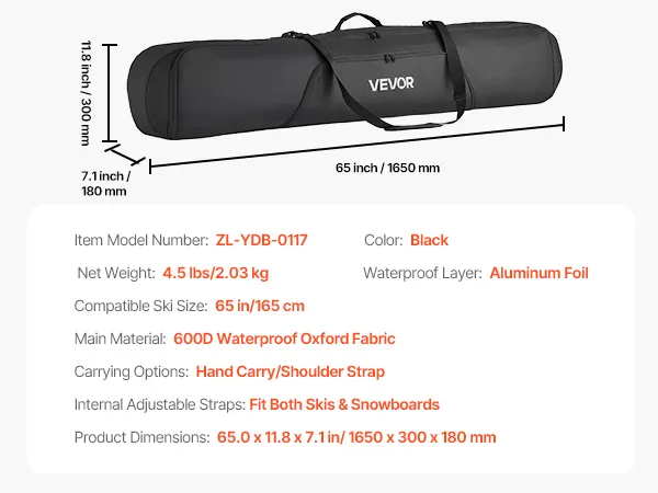 VEVOR Snowboard Bag, Up to 65 in/165 cm, Padded Skis & Snowboards Bag for Air Travel, 600D Waterproof Oxford Fabric, with Adjustable Inner Straps, for Skis Poles Goggles Gloves Helmet Boots (Black)