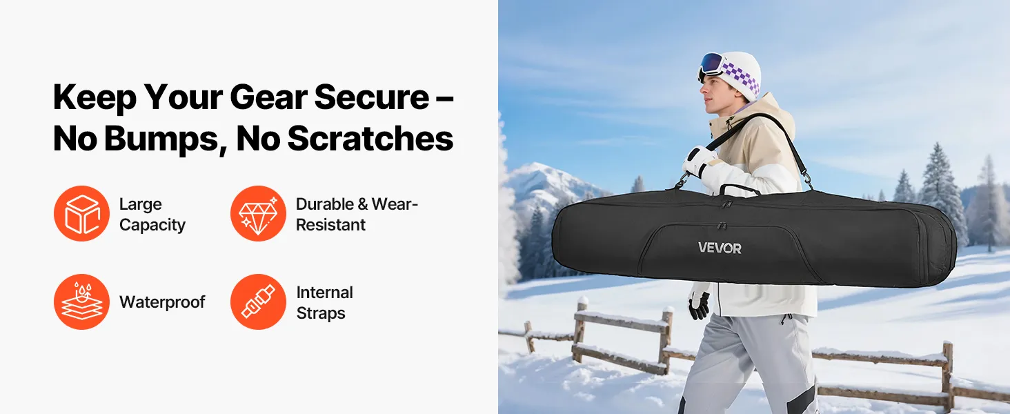 This padded snowboard bag ensures secure and reliable transport for your gear at ski resorts, during travel, or at home.