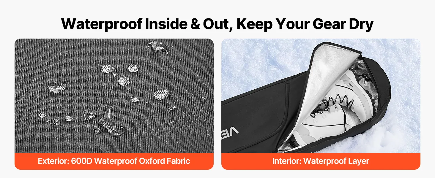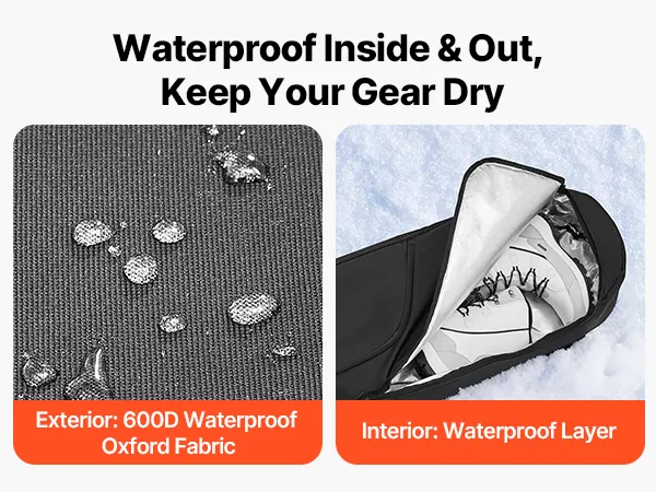Made of lightweight 600D waterproof Oxford fabric with a protective lining, this snowboard bag for air travel keeps snow and rain out, shielding your gear from dampness and rust while making the bag easy to carry.