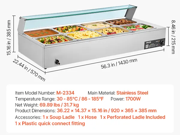 Made of stainless steel for durability and easy cleaning, this food warming features a wide U-shaped heating tube, adjustable temperature (30-85°C / 86-185°F), and a large chamber ideal for hotels, buffets, snack bars, and outdoor parties.