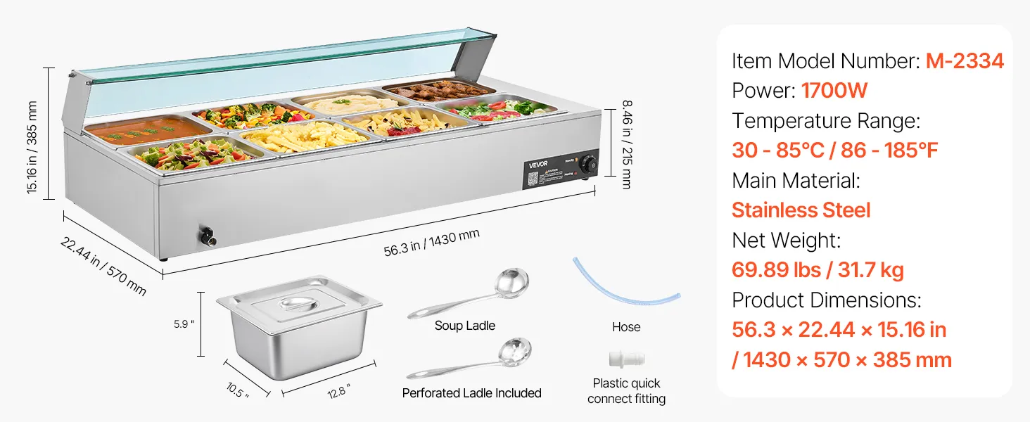 VEVOR Commercial Food Warmer, 1700W Electric Stainless Steel Steam Food Warmer with Glass Cover, 8-Pan Countertop Buffet Bain Marie with Soup & Perforated Ladles, for Catering, Restaurant & Party