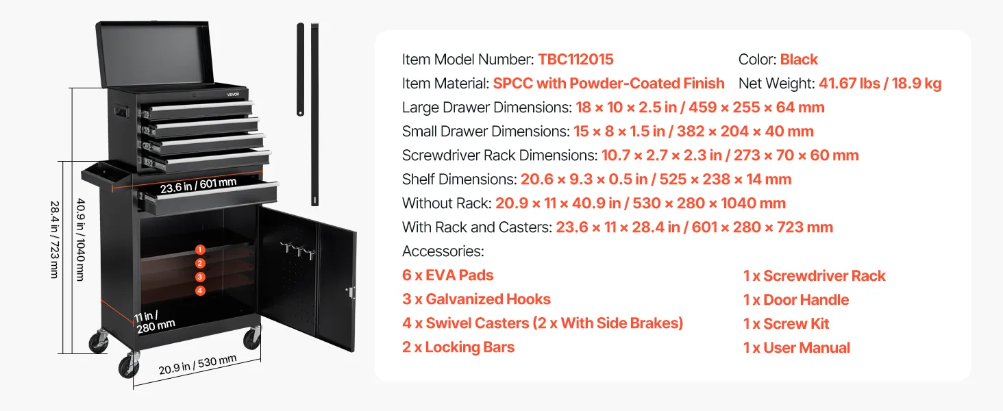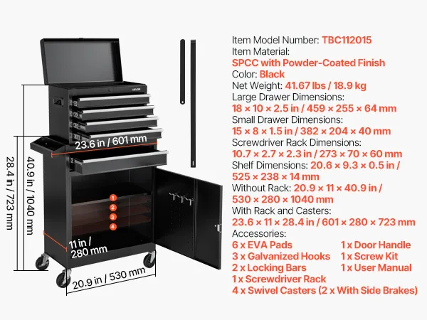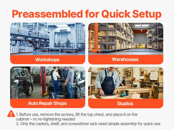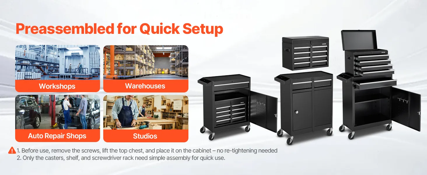 This rolling tool chest with drawers is ideal for tool organization in factory workshops, equipment storage and transport in auto repair shops, and large tool placement in warehouses or garages. Come with pre-assembled—just attach the casters, screwdriver rack, and door handles for quick setup.
