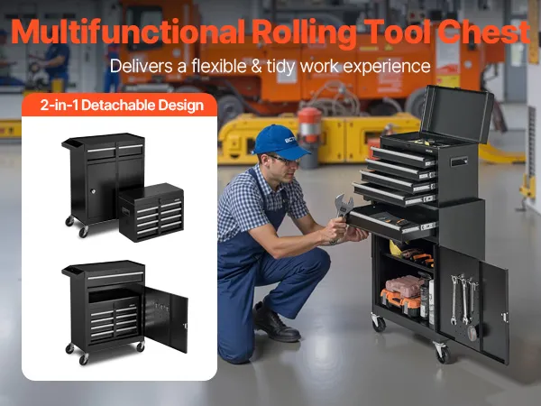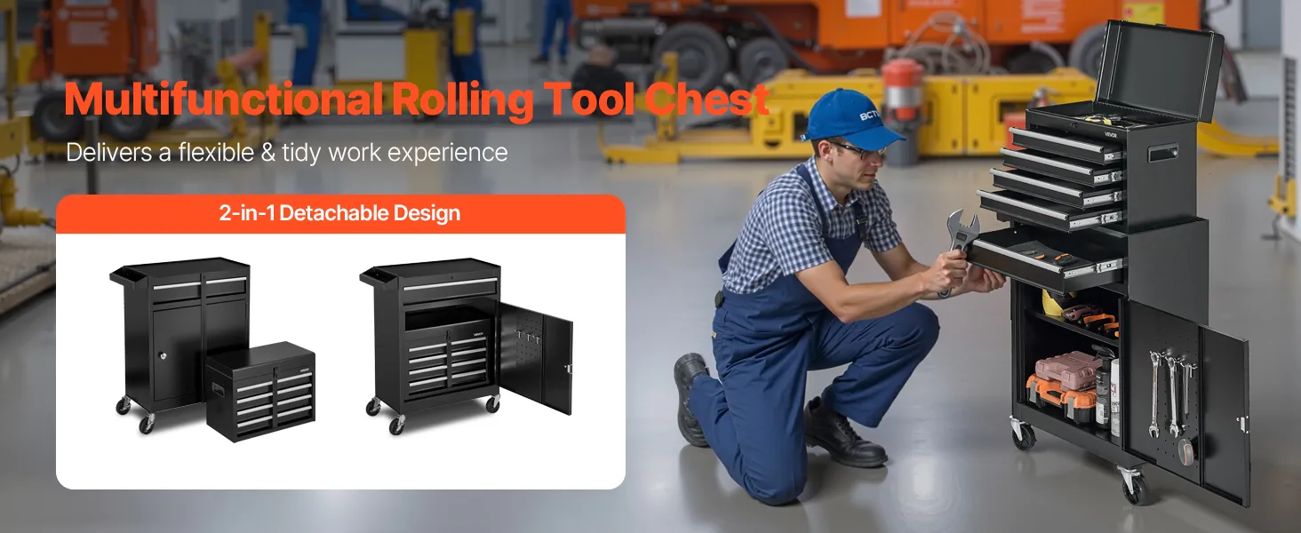This rolling tool chest can be detached into a four-drawer tool chest and a movable cabinet. The combination of the top tray, drawer box, bottom cabinet with rollers, and side tool rack is designed to provide sufficient storage for various tools and convenient access for you.