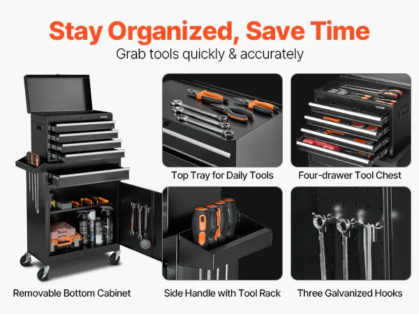 This rolling tool cabinet combines a top tray, a four-drawer tool chest, a movable bottom cabinet, three galvanized hooks, and a side handle with a tool rack. Multiple drawers store tools in categories, and side hooks with a top tray expand storage space. Ideal for tool organization.