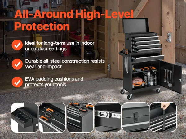 Crafted from heavy-duty cold-rolled steel with a powder-coated finish, our stand up tool box resists corrosion, rust, and wear. The built-in EVA padding in the workbench and drawers can insulate heat and cushion tools to avoid vibration and noise, extend the lifespan of tools and the tool chest.