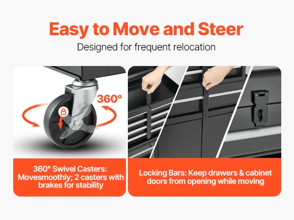 Equipped with four swivel casters, the rolling tool storage cabinet can push and adjust its position easily. It combines two brake locks for stability and a locking bar for locking drawers and cabinet doors simultaneously without opening when moving. Securing the transportation of tools.