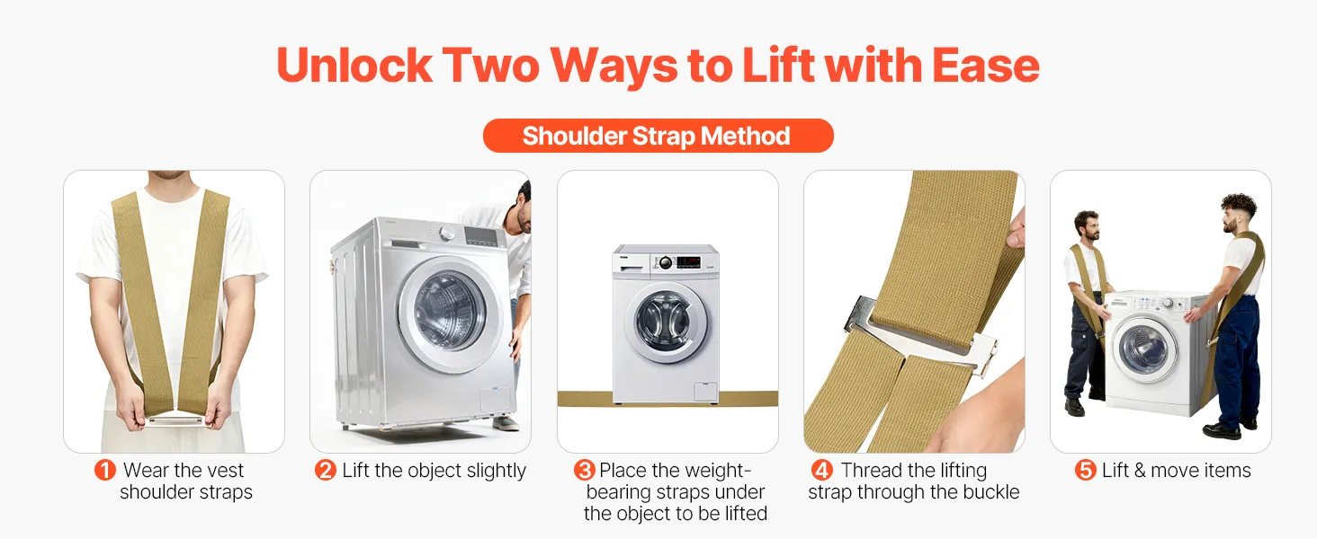 Our furniture lifting strap features a simple wearing design, allowing you to choose between a shoulder-mounted strap or an arm-mounted strap for easy carrying. The wearing steps are clear and quick, taking just a few minutes to master, simplifying complex moving tasks.