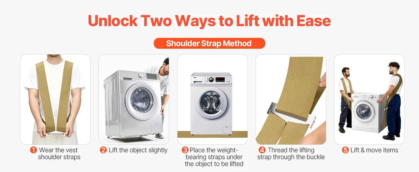 Our furniture lifting strap features a simple wearing design, allowing you to choose between a shoulder-mounted strap or an arm-mounted strap for easy carrying. The wearing steps are clear and quick, taking just a few minutes to master, simplifying complex moving tasks.