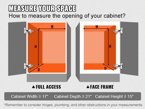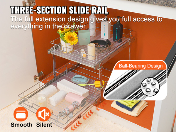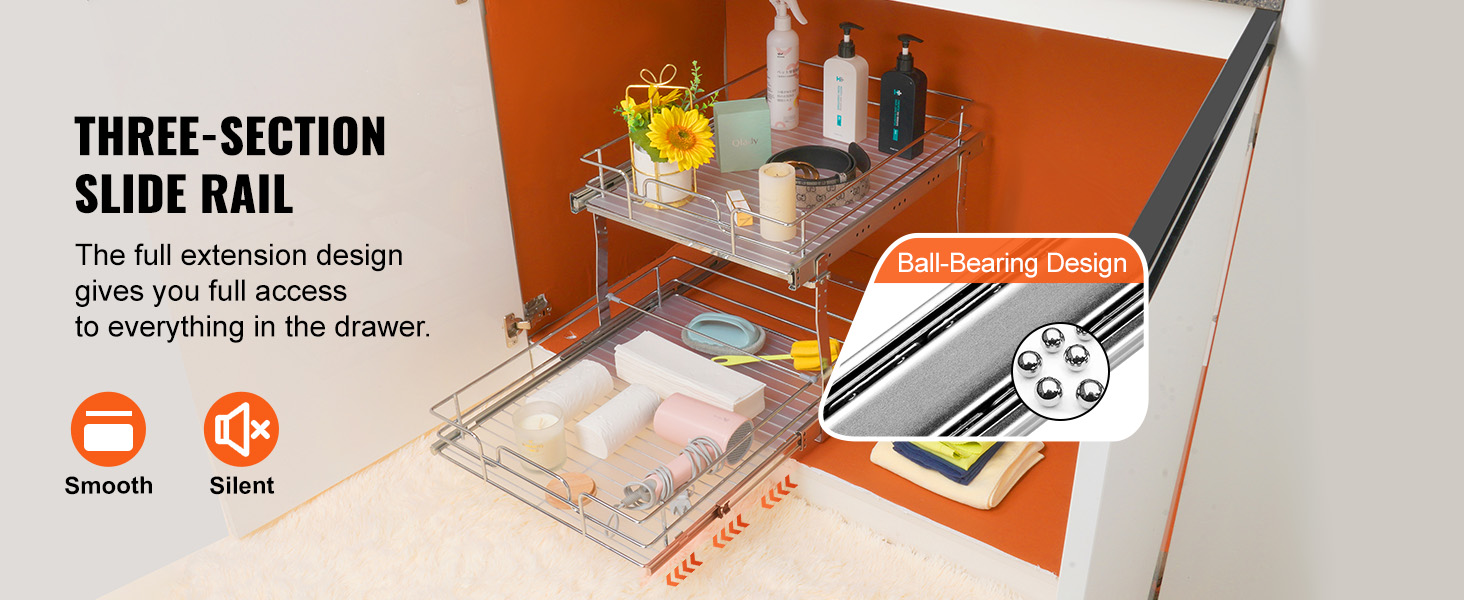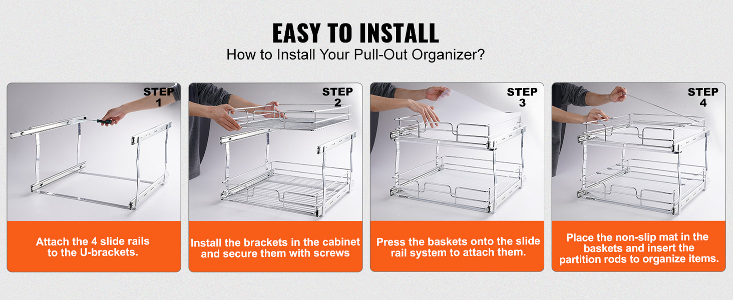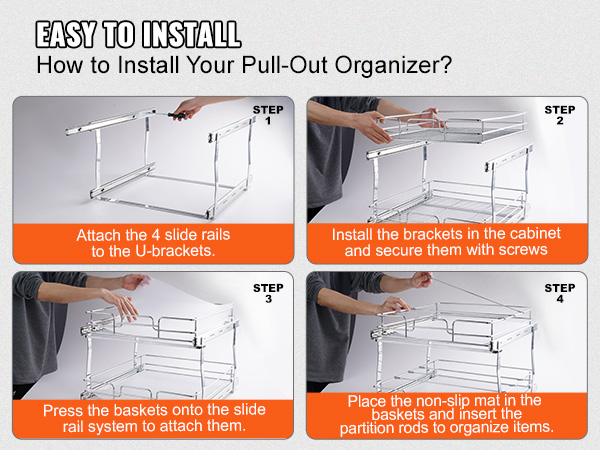 • Easy Installation: Our under sink slide out cabinet shelve only takes 4 easy steps to complete the installation, greatly saving time. It can be installed on the left or right side, which is suitable for cabinets and effectively avoids the water pipe. Once installed at the bottom of the cabinet, the organizer can be pulled out smoothly, which is very convenient and practical. Installation dimensions: Cabinet width ≥17″, cabinet depth ≥21″, cabinet height ≥ 15″.