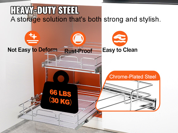 • Створено для тривалого використання: Наша висувна полиця для шафи виготовлена ​​з високоякісної сталі, яка стійка до іржі та деформації. Вона також достатньо міцна, щоб витримувати вагу до 29 кг, і може легко витримувати важкі предмети. Хромована поверхня робить полицю привабливішою, запобігаючи подряпинам на поверхні. Лоток знімний, легко миється та забезпечить охайність вашого дому.