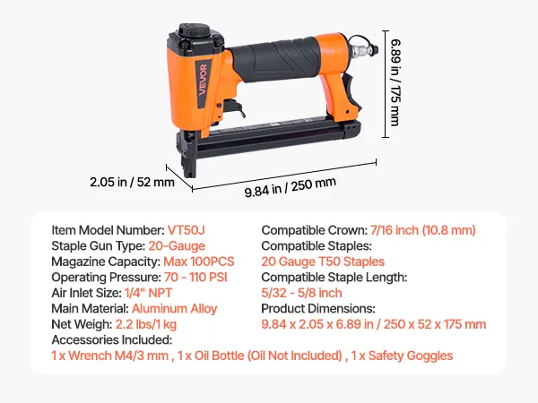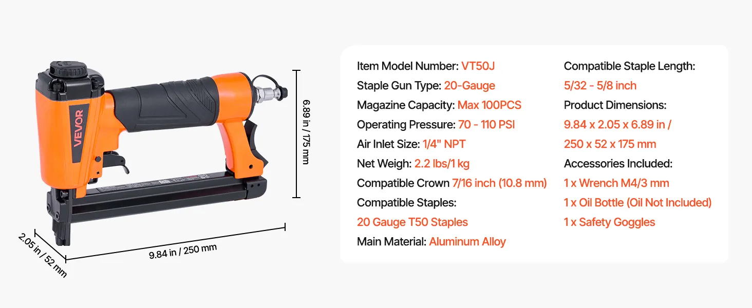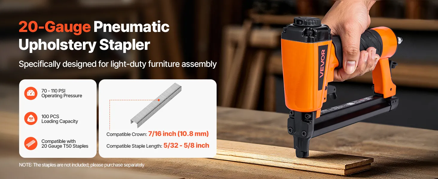This pneumatic staple gun is compatible with 20 gauge T50 staples featuring a 7/16" (10.8mm) crown size and 5/32" to 5/8" (4mm - 16mm) staple lengths. High-capacity loading magazine holds up to 100pcs staples at a time, ideal for upholstery, cabinetry, furniture framing, and wood assembly.