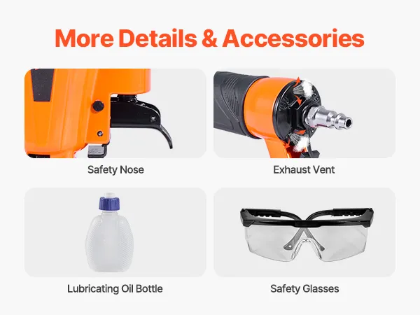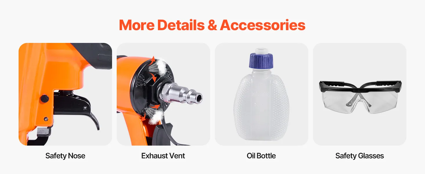 Our pneumatic upholstery gun includes a safety trigger switch to prevent accidental firing, a rotatable exhaust design to direct air away from the user, and safety glasses to protect your eyes during operation.
