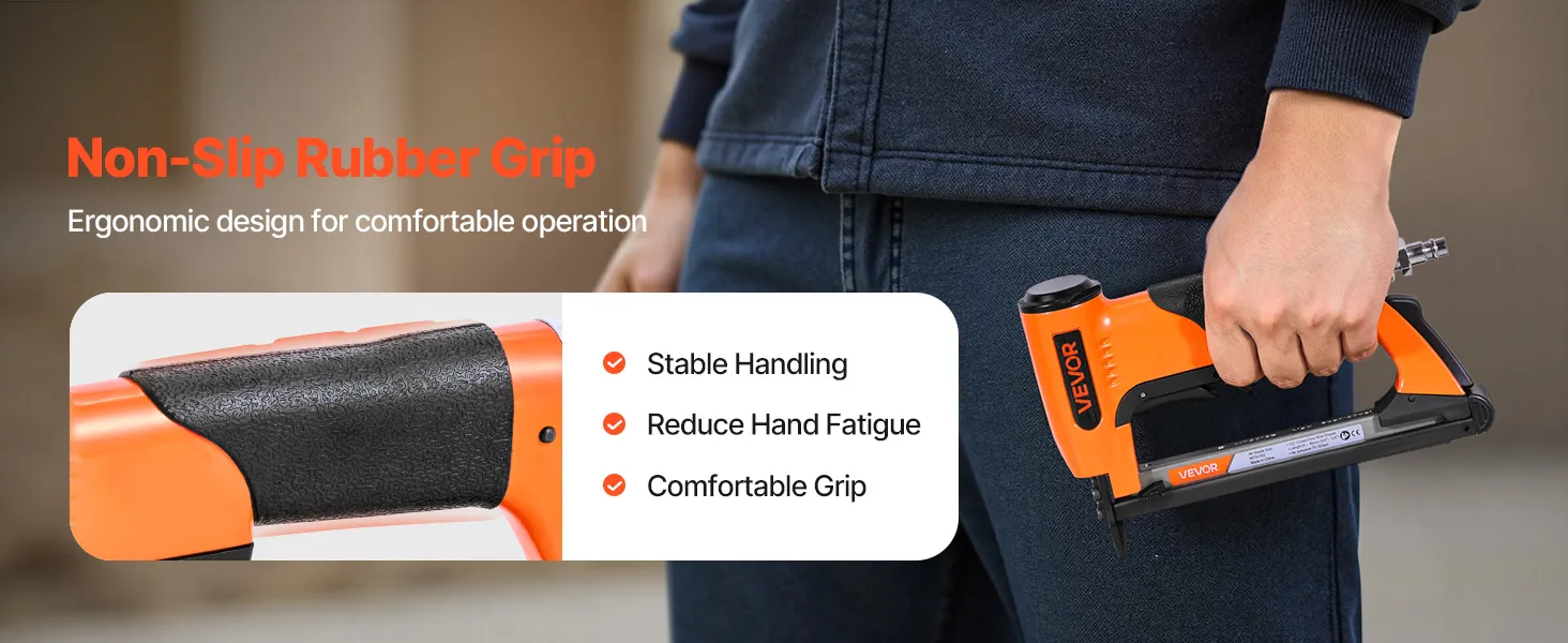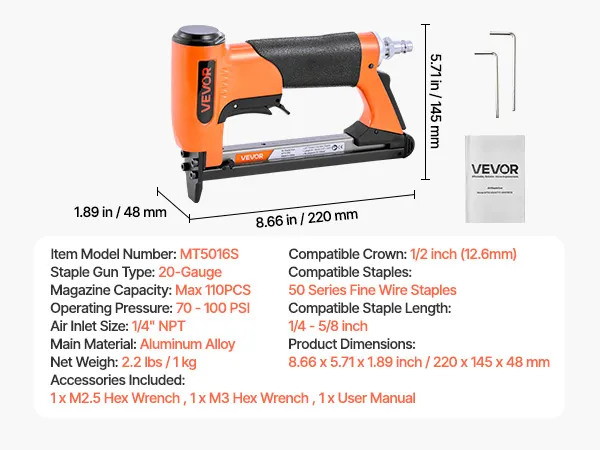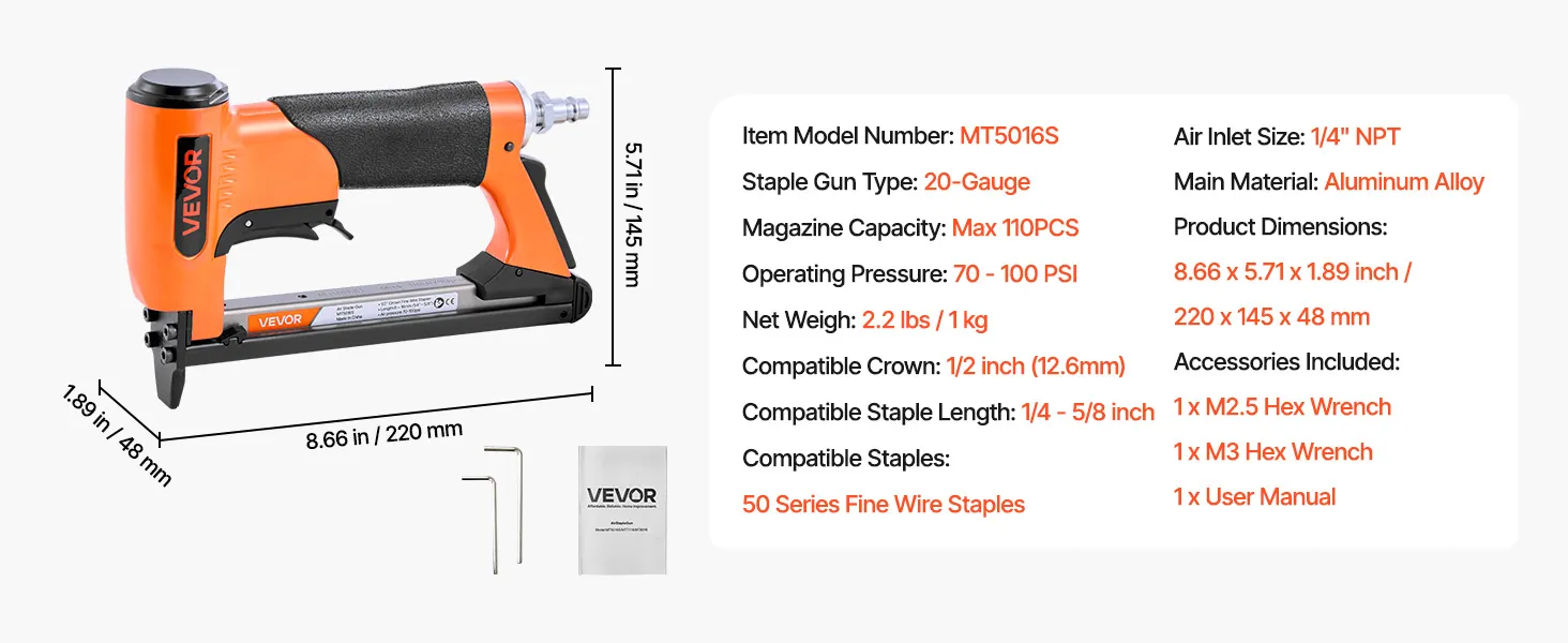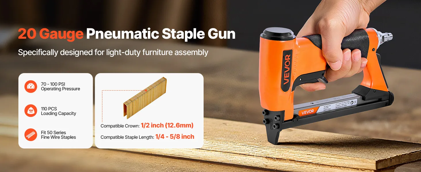 This 20-gauge pneumatic staple gun is compatible with 50 series fine wire staples - featuring a 1/2-inch (12.8mm) crown size and 1/4" to 5/8" (6-16mm) staple lengths. High-capacity loading magazine holds up to 110pcs staples, ideal for upholstery, cabinetry, furniture framing, and woodworking.