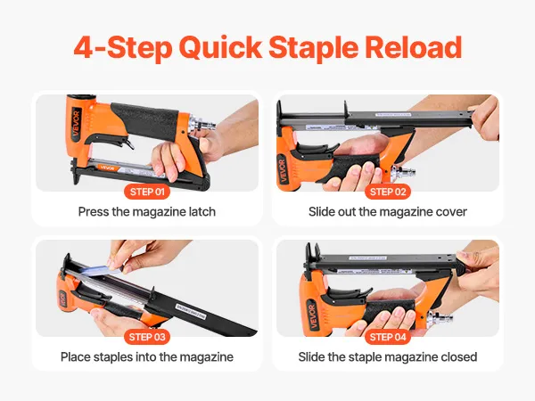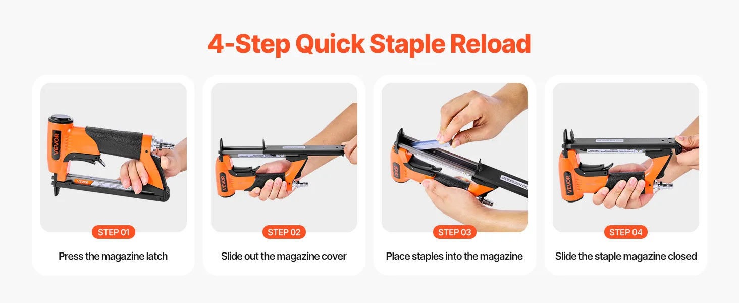 Equipped with a large-capacity loading magazine that holds up to 110pcs staples at once, this air stapler gun minimizes the need for frequent reloading and allows for more efficient operation. (Staples not included; please purchase separately)