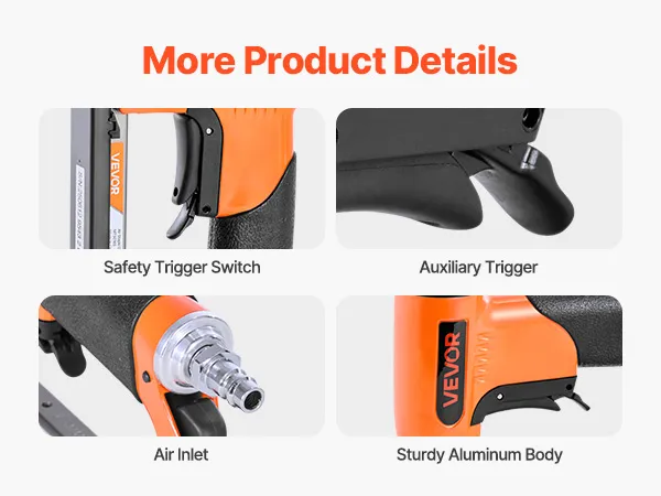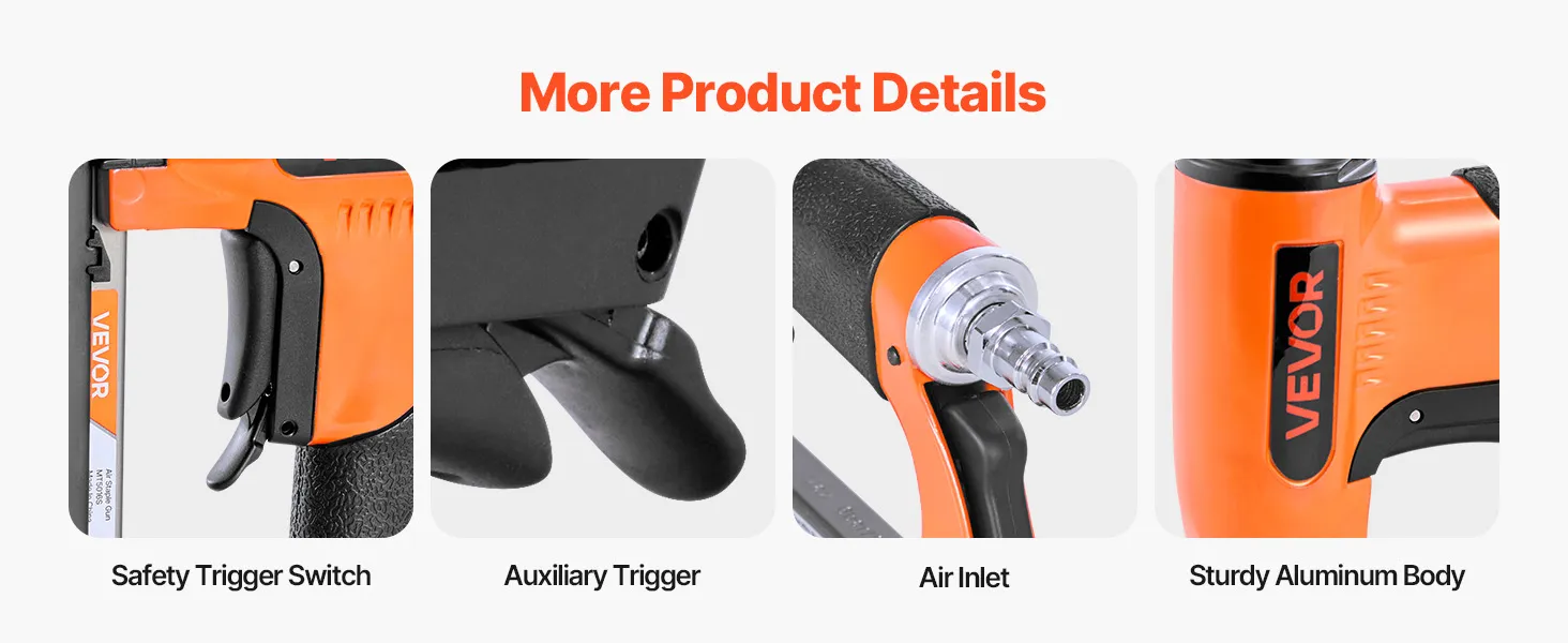 Our pneumatic upholstery gun includes a safety trigger switch to prevent accidental firing, a rear exhaust design, and sequential firing mode prevents accidental firing for safer operation.