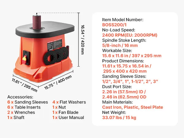 This benchtop spindle sander is equipped with a 2000 RPM high-speed motor, a wide cast iron worktable, 16mm stroke, and 6 sanding sleeves (12.7 mm, 19 mm, 25.4 mm, 38.1 mm, 50.8 mm, 76.2 mm) for efficient sanding.
