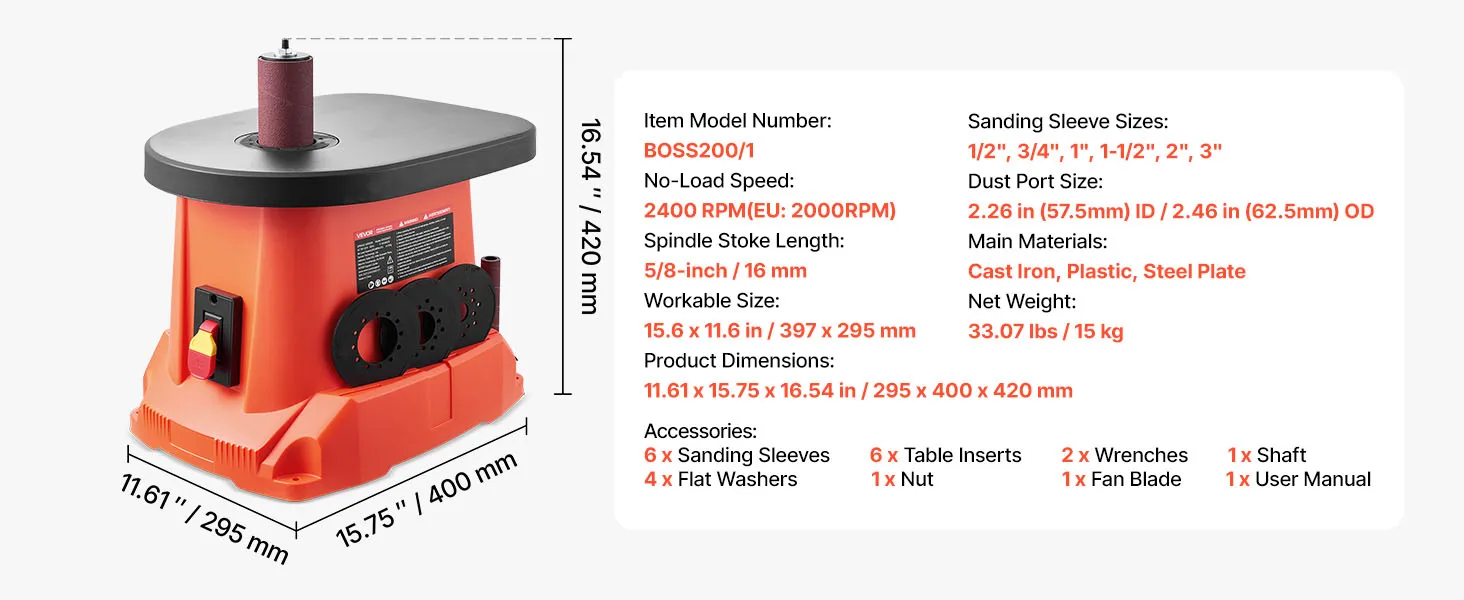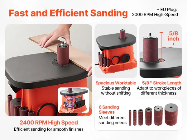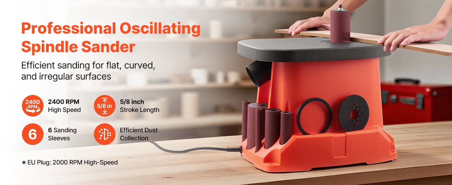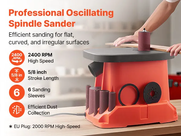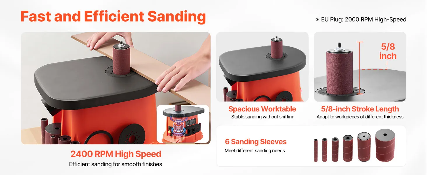 Whether for furniture sanding or DIY projects, this oscillating spindle sander delivers a smooth experience. With a 2000 RPM high-speed rotation, 6 sanding sleeves, a 16mm stroke length, and a spacious cast iron worktable, it ensures more precise and efficient sanding for smooth finishes.