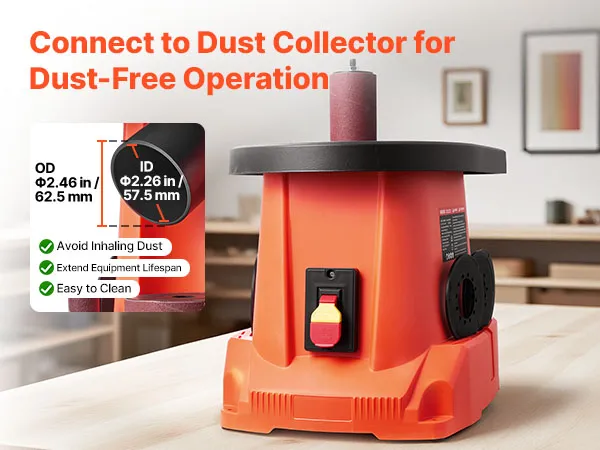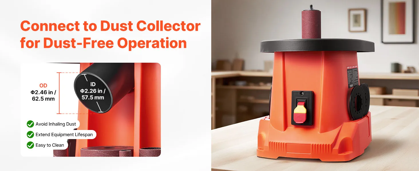 Equipped with a 57.5mm (ID) and 62.5mm (OD) dust port, the spindle sander connects easily to vacuum hoses for dust-free operation, reducing cleanup, extending equipment life, and keeping your workspace clean.