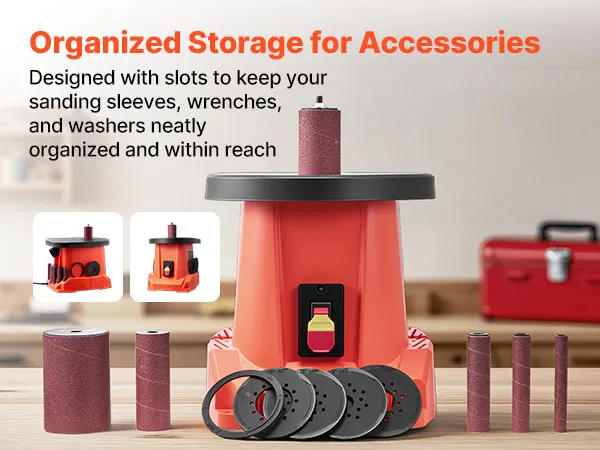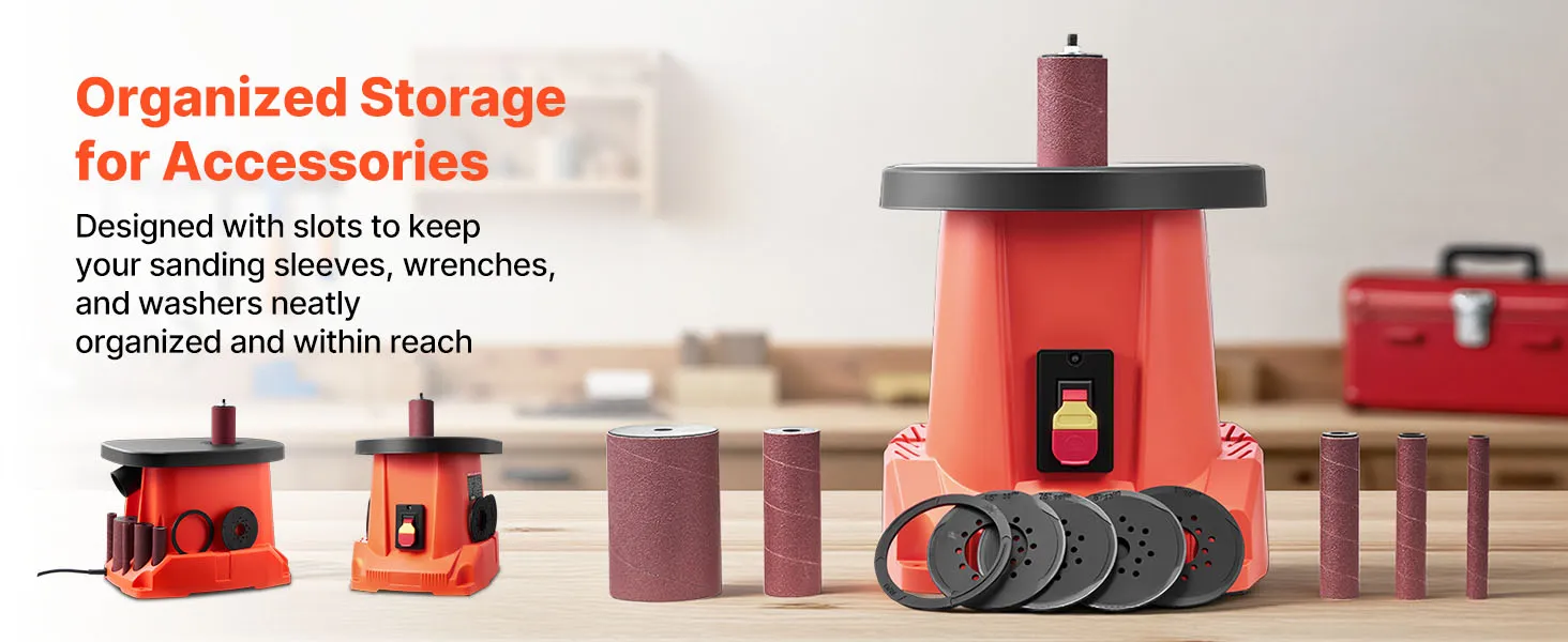 Integrated slots keep the sanding sleeves and table inserts neatly organized, preventing part loss and ensuring quick access during work.