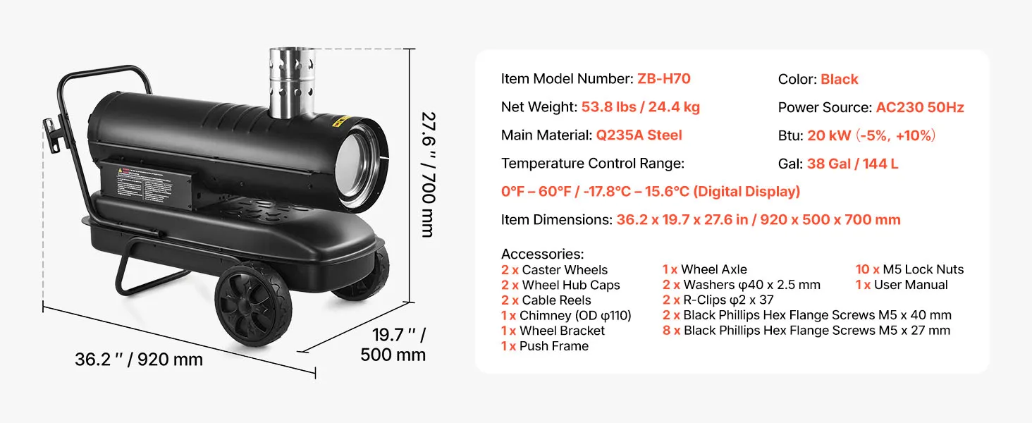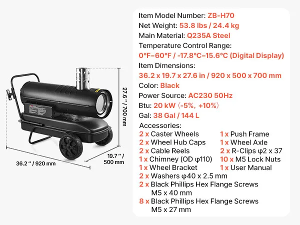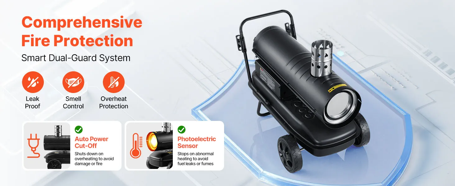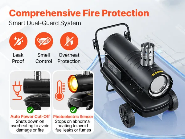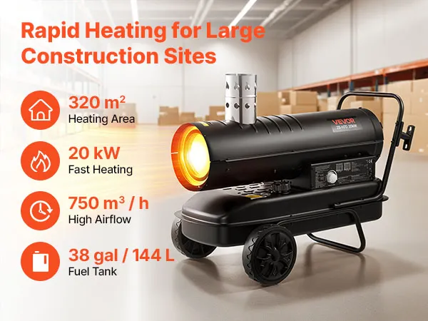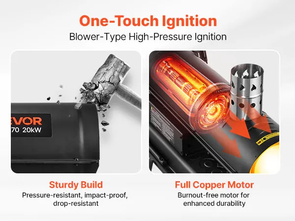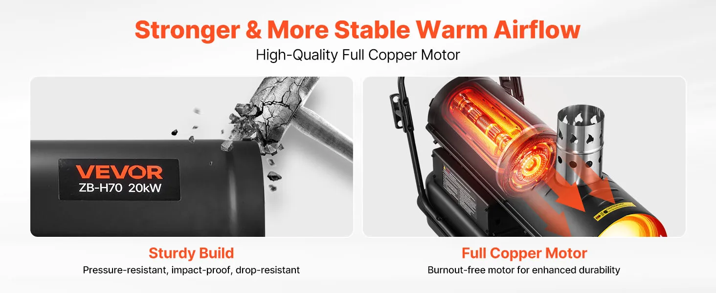 Equipped with a full-copper motor for stable output and extended use. The solid housing handles rough handling well, making this kerosene heater a reliable choice on job sites.