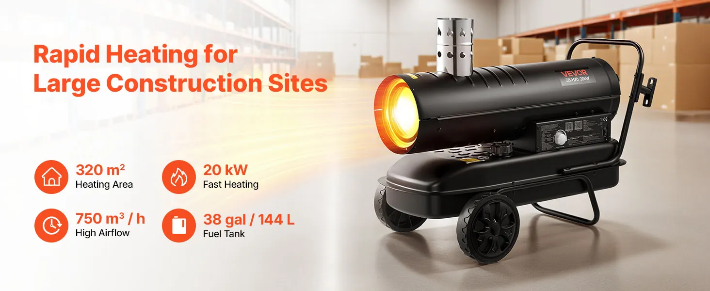 VEVOR 20kW Forced Air Kerosene Diesel Heater, Portable Torpedo Space Heater with Wheels & Adjustable Temp, Blower-Type for Jobsite/Garage/Warehouse/Workshop Construction /Outdoor Heating,Black