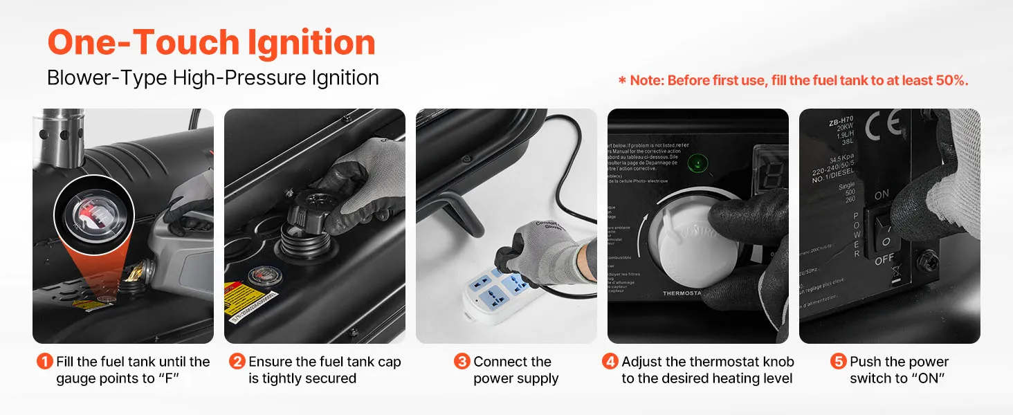 Skip manual ignition—start heating instantly with just one press. This portable kerosene heater is simple to operate, even in cold mornings or low-light settings.