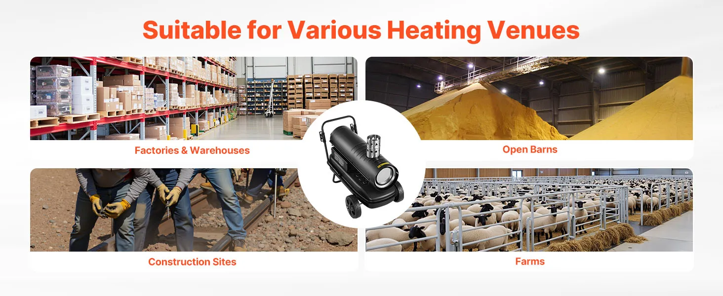 Delivers warm air in minutes with high airflow and strong power. This kerosene forced air heater is ideal for outdoor sites, workshops, and warehouses needing fast, consistent heat.