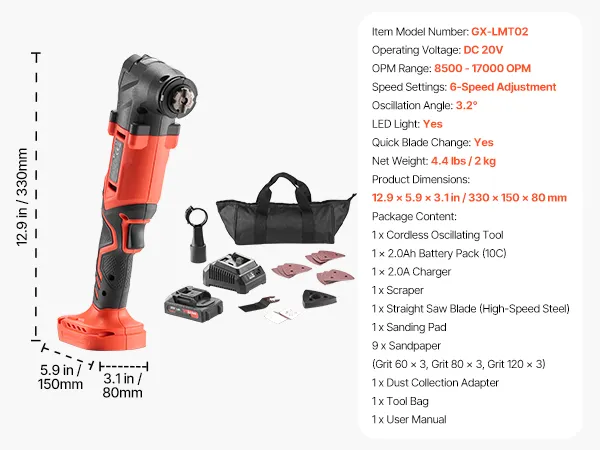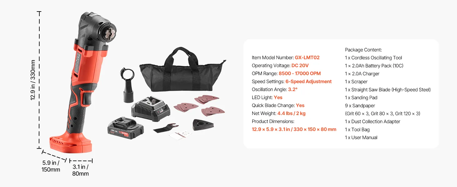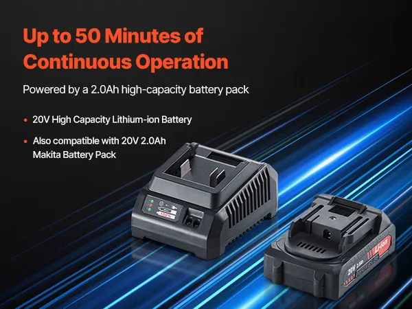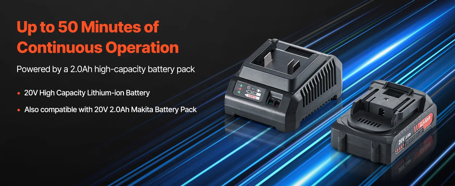 Equipped with a 20V 2.0Ah high-capacity lithium battery and a 2A battery charger, this oscillating tool delivers long-lasting power for extended tasks. Its cordless design gives you the freedom to work without being limited by power cords.