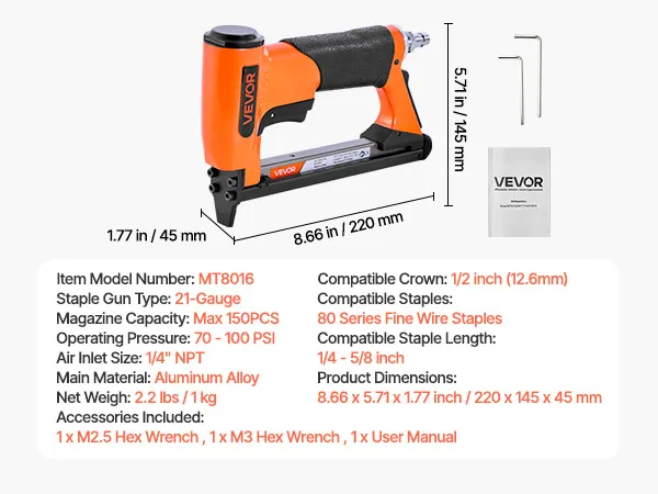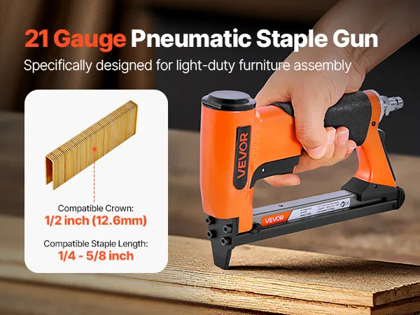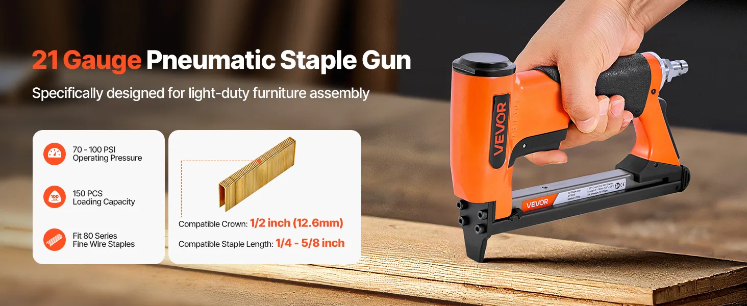 This 21-gauge pneumatic staple gun is compatible with 80 series fine wire staples - featuring a 1/2-inch (12.8mm) crown size and 1/4" to 5/8" (6-16mm) staple lengths. High-capacity loading magazine holds up to 150pcs staples, ideal for upholstery, cabinetry, furniture framing, and woodworking.