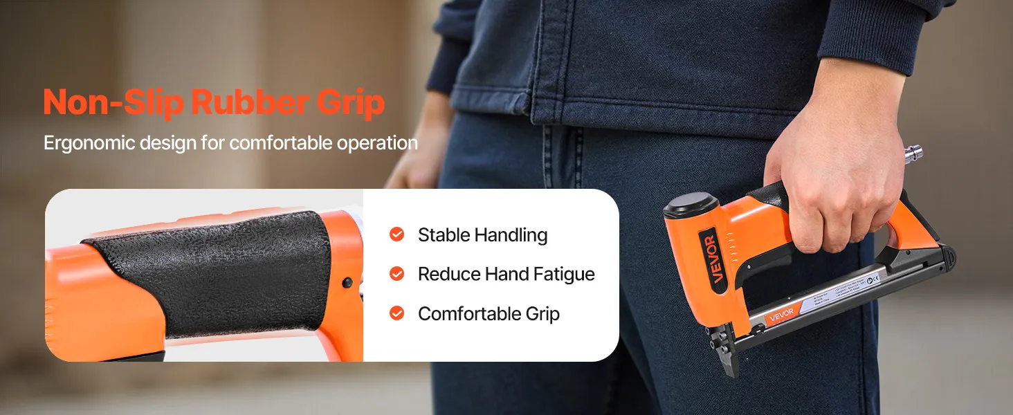 Our pneumatic upholstery gun includes a safety trigger switch to prevent accidental firing, a rear exhaust design, and sequential firing mode prevents accidental firing for safer operation.