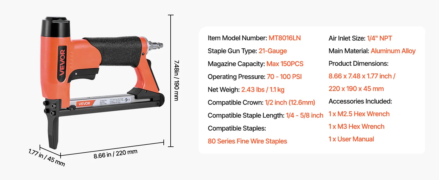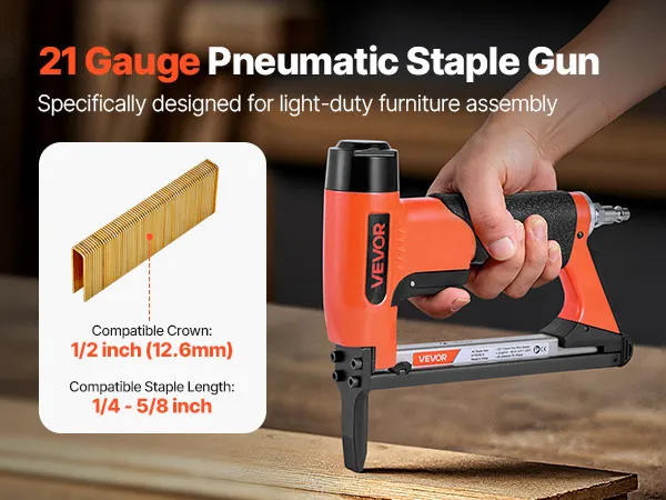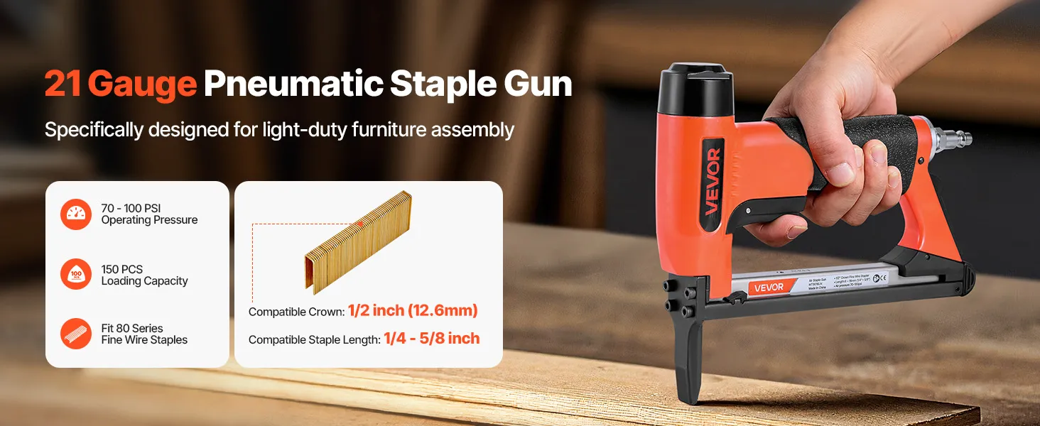 This 21-gauge pneumatic staple gun is compatible with 80 series fine wire staples - featuring a 1/2-inch (12.8mm) crown size and 1/4" to 5/8" (6-16mm) staple lengths. High-capacity loading magazine holds up to 150pcs staples, ideal for upholstery, cabinetry, furniture framing, and woodworking.