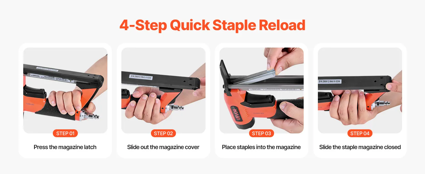 Equipped with a large-capacity loading magazine that holds up to 150pcs staples at once, this air stapler gun minimizes the need for frequent reloading and allows for more efficient operation. (Staples not included; please purchase separately)