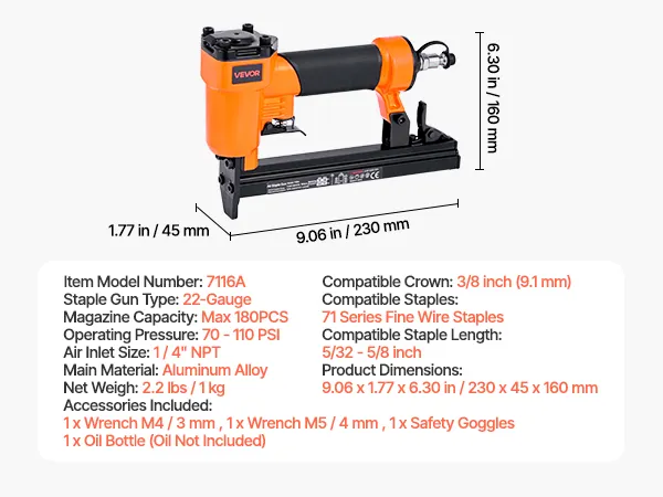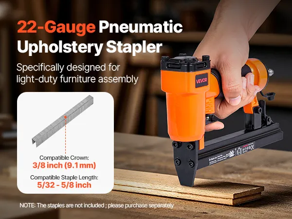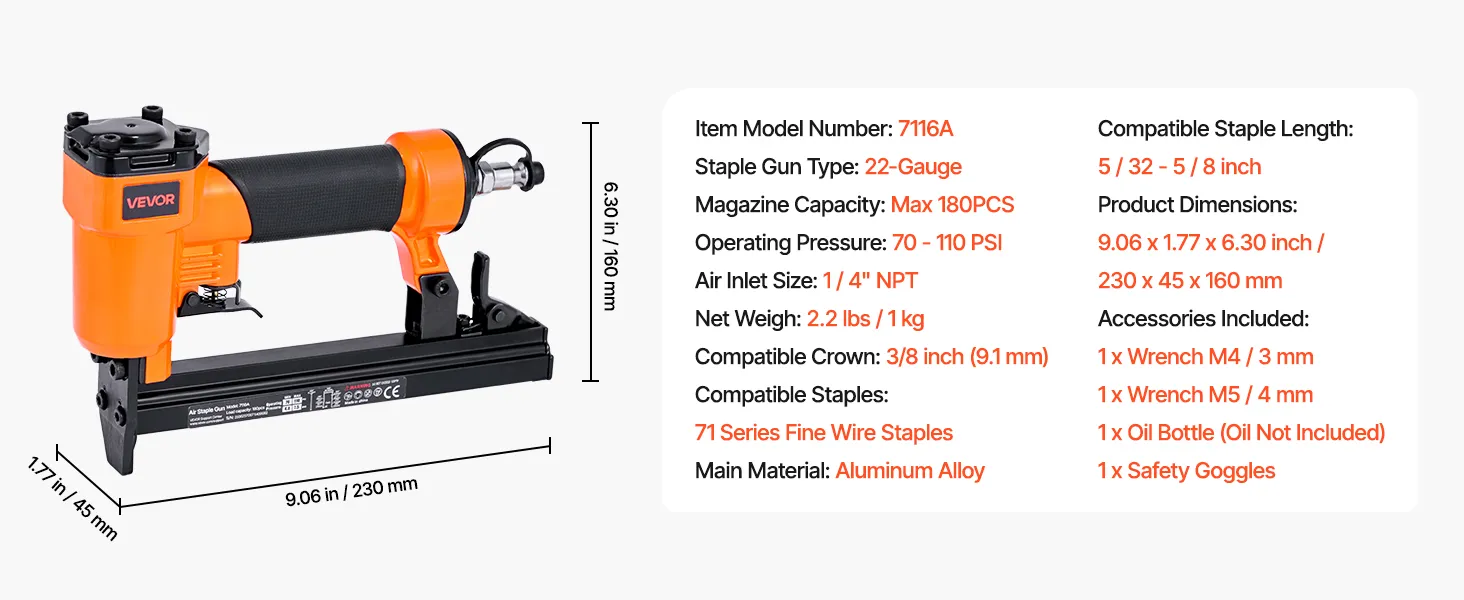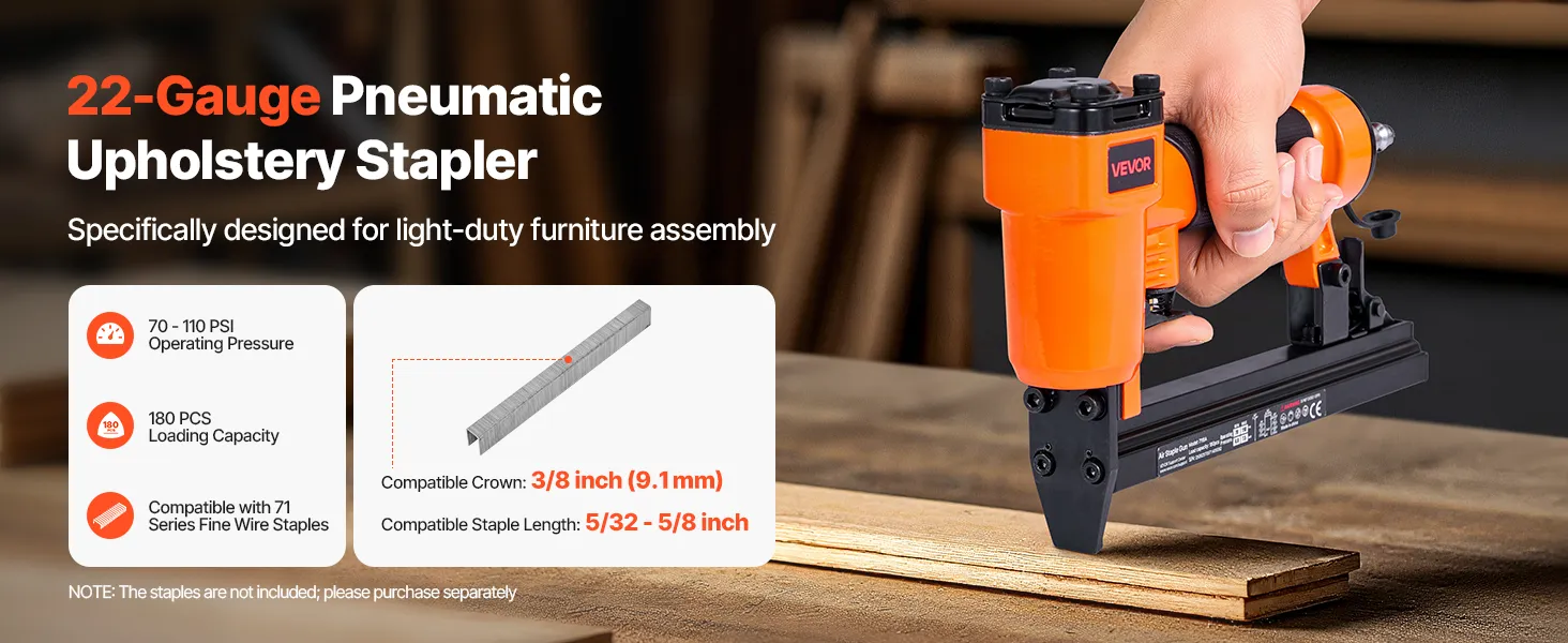 This 22-gauge pneumatic staple gun is compatible with 71 series fine wire staples, featuring a 3/8" (9.1mm) crown size and 5/32" to 5/8" (4mm-16mm) staple lengths. High-capacity loading magazine holds up to 180pcs staples, ideal for upholstery, cabinetry, furniture framing, and woodworking.
