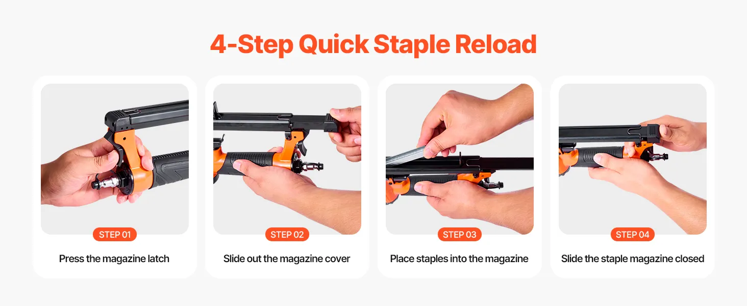 Equipped with a large-capacity loading magazine that holds up to 180pcs staples at once, this air stapler gun minimizes the need for frequent reloading and allows for more efficient operation. (Staples are not included; please purchase separately)
