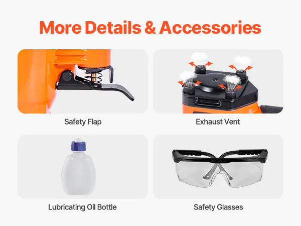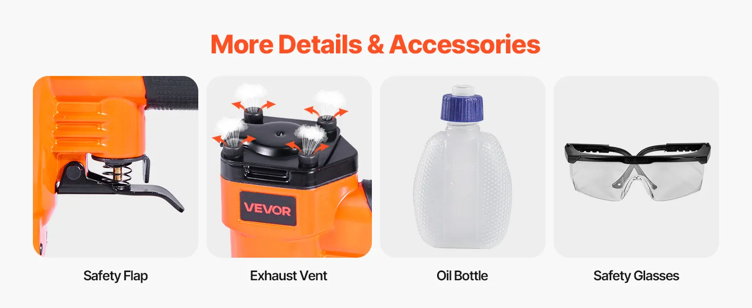 Our pneumatic upholstery stapler features a safety flap, a front exhaust design, and safety glasses to protect your eyes during operation.