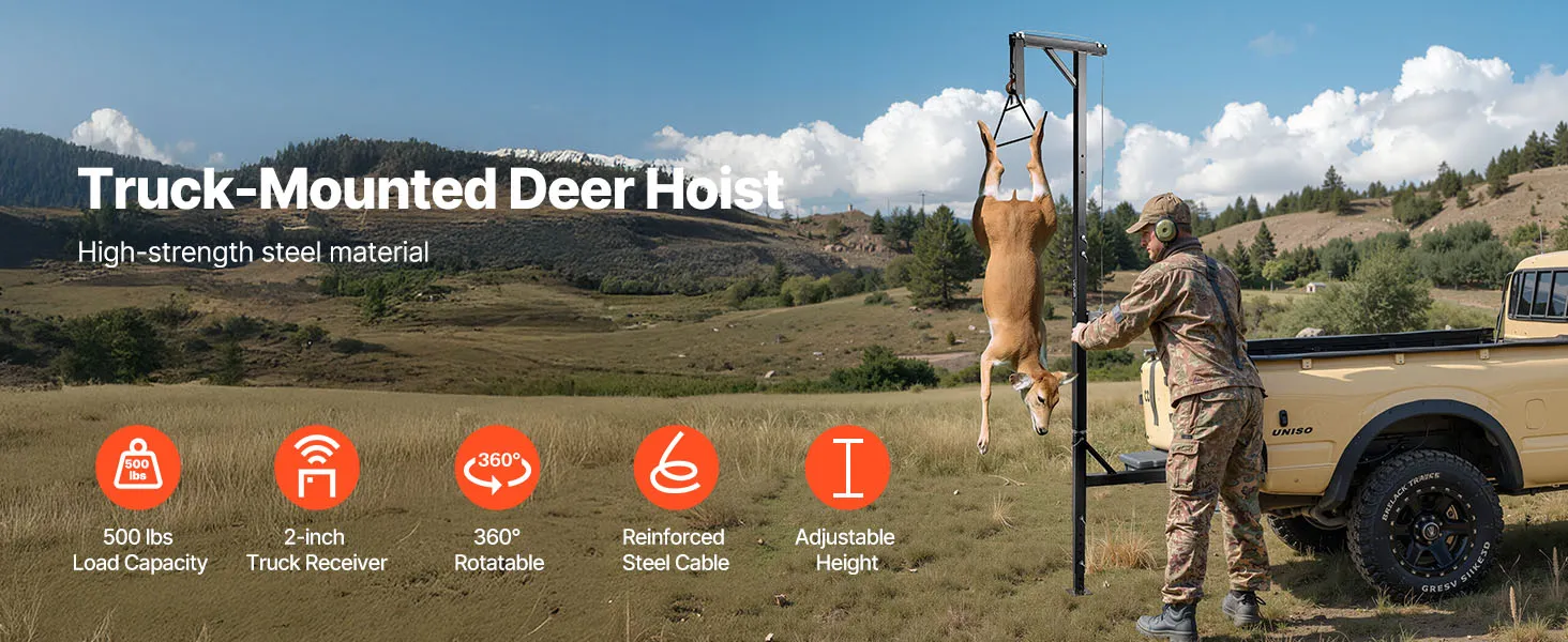 VEVOR Truck Hitch Game Hoist, 500 lbs Load Capacity, Hunting Deer Hoist with 2-inch Receiver, 360-Degree Swivel Shaft & Adjustable Height, Includes Gambrel Winch for Skinning & Cleaning Game