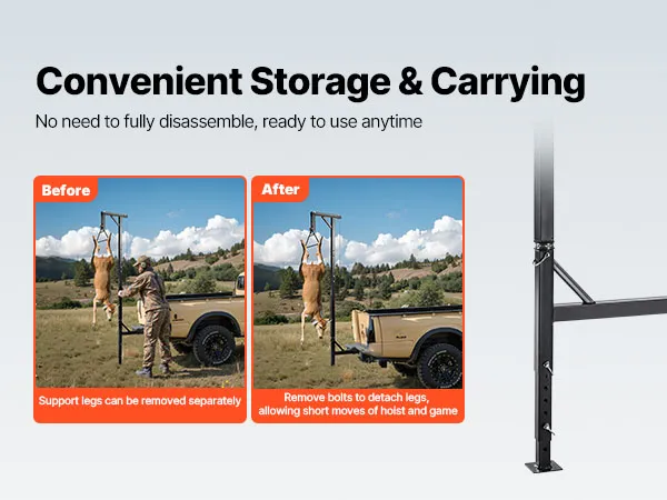 The truck hitch game hoist can be conveniently stored by folding the support legs when not in use, with no need for complete disassembly. No reinstallation is needed for the next use.
