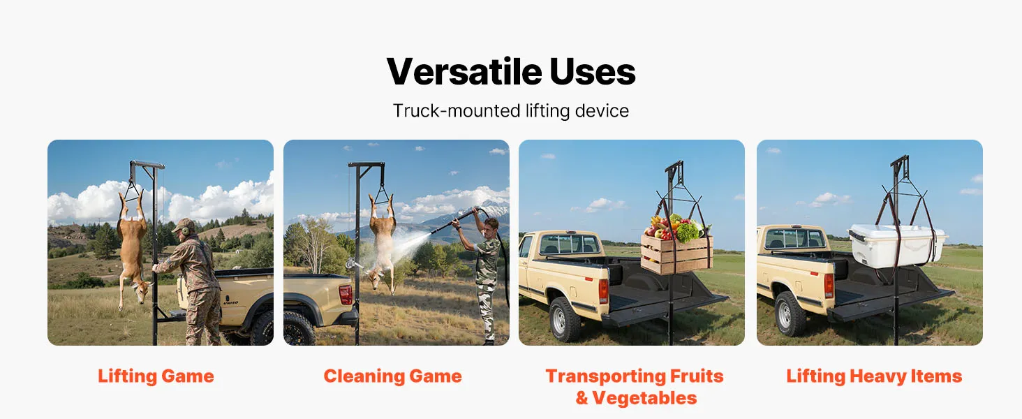 This manual game hoist offers stable support, lifting up to 500 lbs of game. Made of durable Q235 carbon steel, with a rust-resistant coating, it's ideal for outdoor hunting, farm work, and lifting heavy items, even in areas without electricity. Easy to clean and maintain.