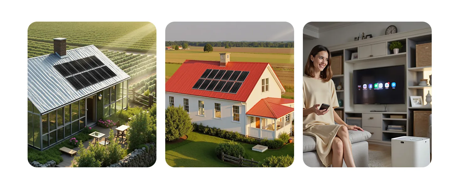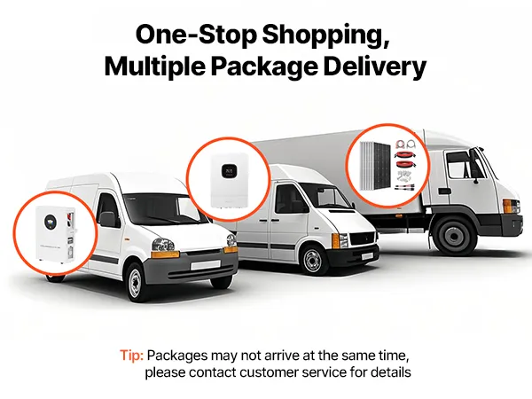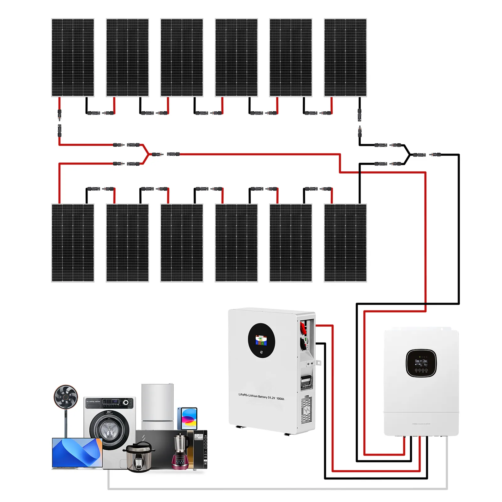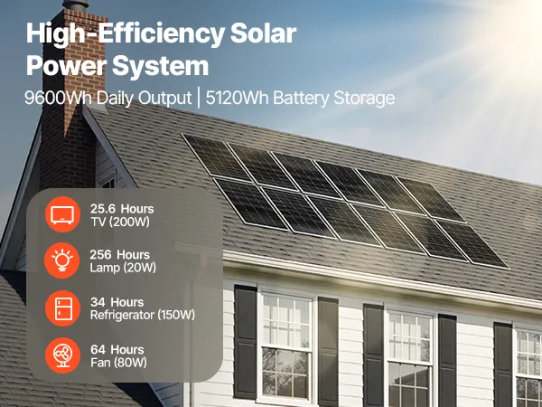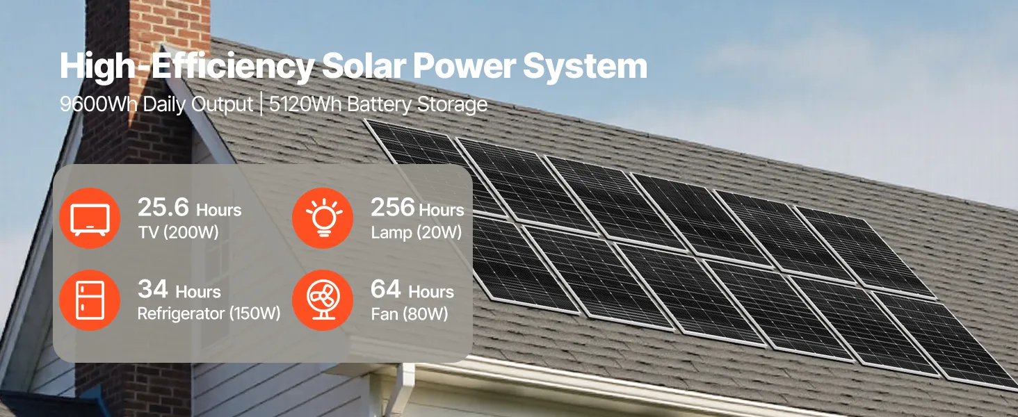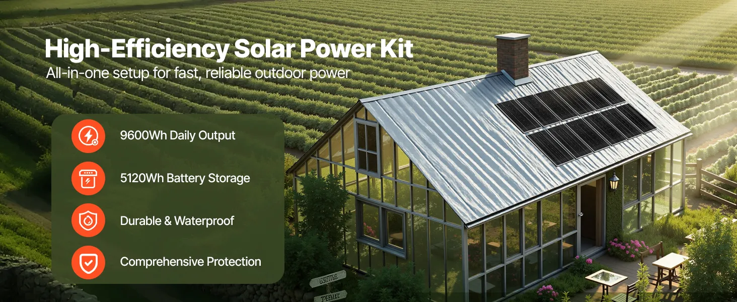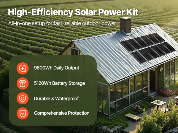 This solar power kit includes 12pcs 200W solar panels, a 51.2V 100Ah LiFePO₄ battery, and a 48V 5000W hybrid solar inverter. With up to 9600Wh/day output and 5120Wh battery storage, it delivers high output to efficiently power large houses, sheds, farms, and high-demand appliances.