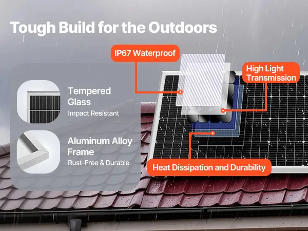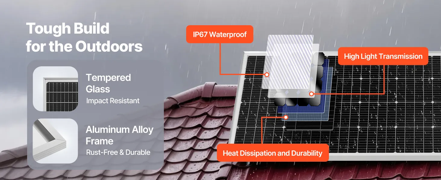 High-efficiency monocrystalline solar cells ensure superior energy conversion. IP67 waterproof rating makes them reliable for long-term outdoor use.