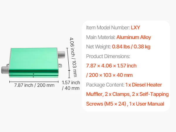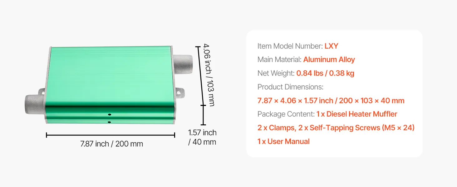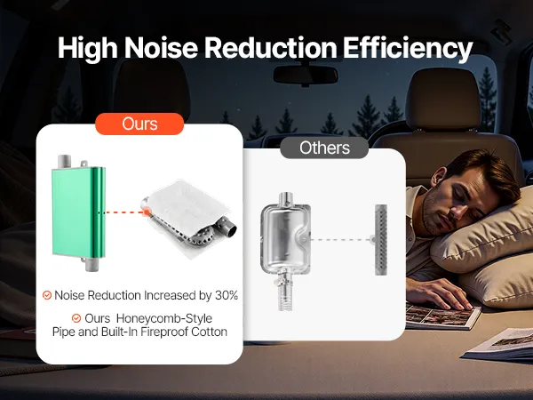 VEVOR diesel heater muffler features an upgraded honeycomb pipe and built-in fireproof cotton for effective noise reduction. Made from durable aluminum alloy, it is easy to install and fits most 2KW, 5KW, and 8KW diesel heaters for long-lasting performance.