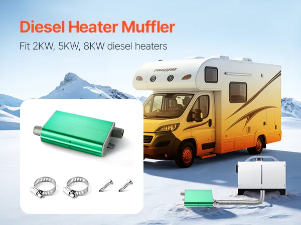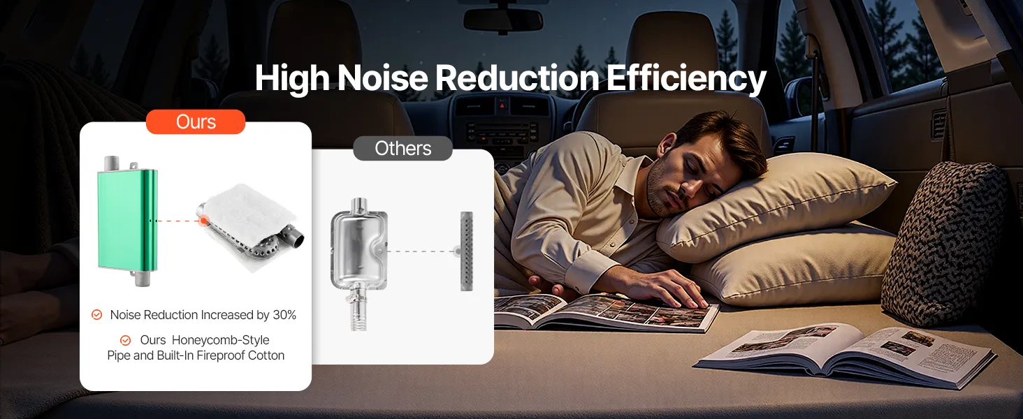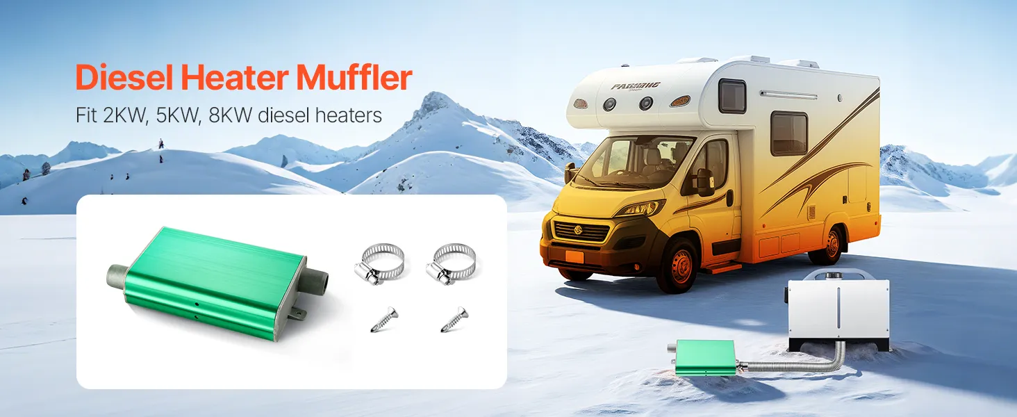 The diesel heater muffler upgrade features an internal honeycomb structure combined with built-in fireproof cotton, reducing noise by up to 30%. It delivers a quieter performance and stable exhaust flow for 2KW, 5KW, and 8KW diesel heaters.