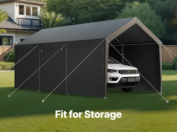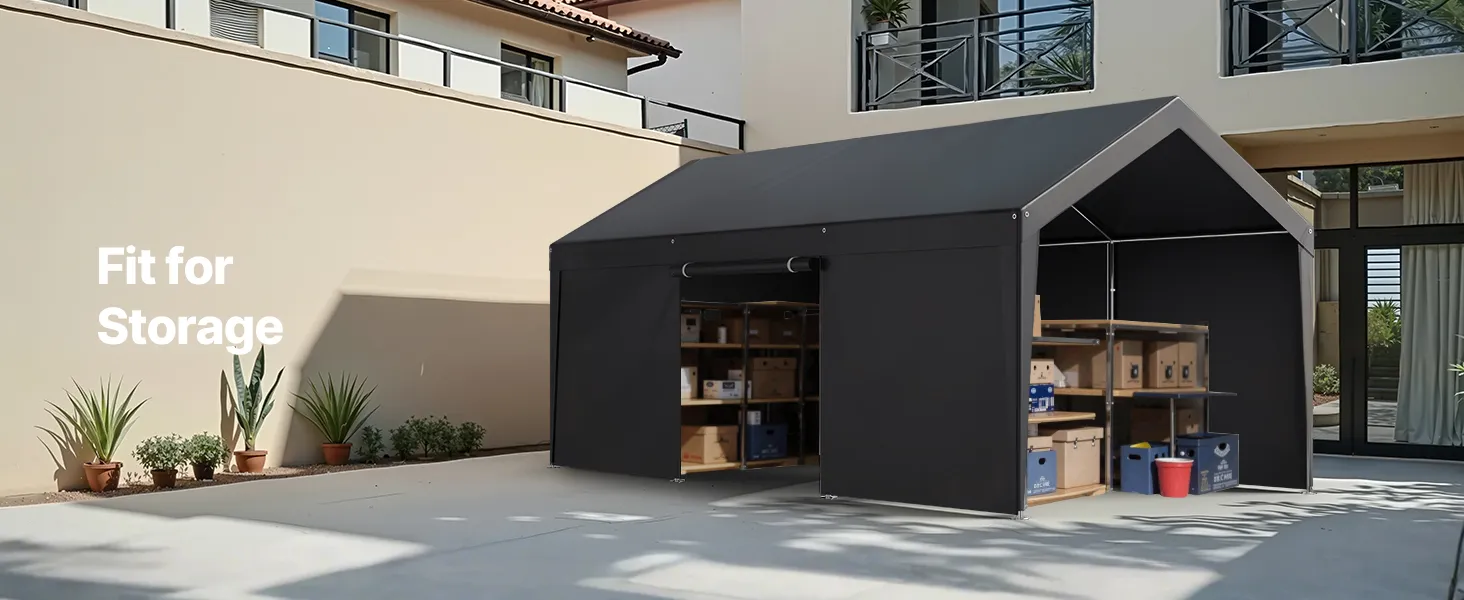 • Protection from Harsh Weather: The carport features a double-coated PE tarp that is UV-resistant and waterproof, providing long-term protection for your car, RV, or outdoor equipment from rain, strong sunlight, and natural elements like dust.