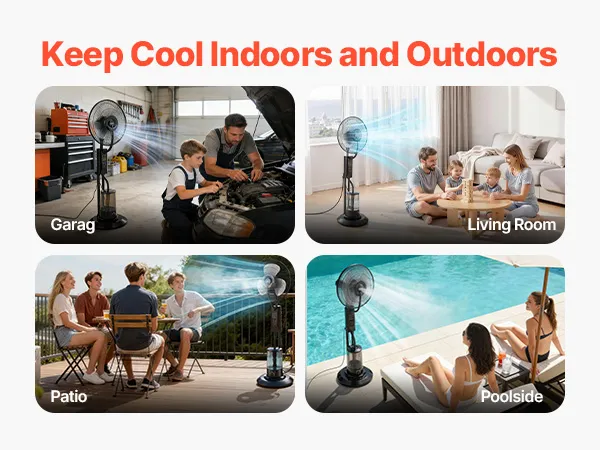 • Wide Angle Flow: With a 70° side swing and over 15° vertical tilt, this fan mister delivers cool air across the room with smooth, even flow. Its broad movement supports both spacious areas and tight corners, offering continuous comfort wherever you place it