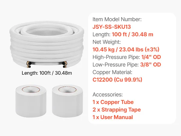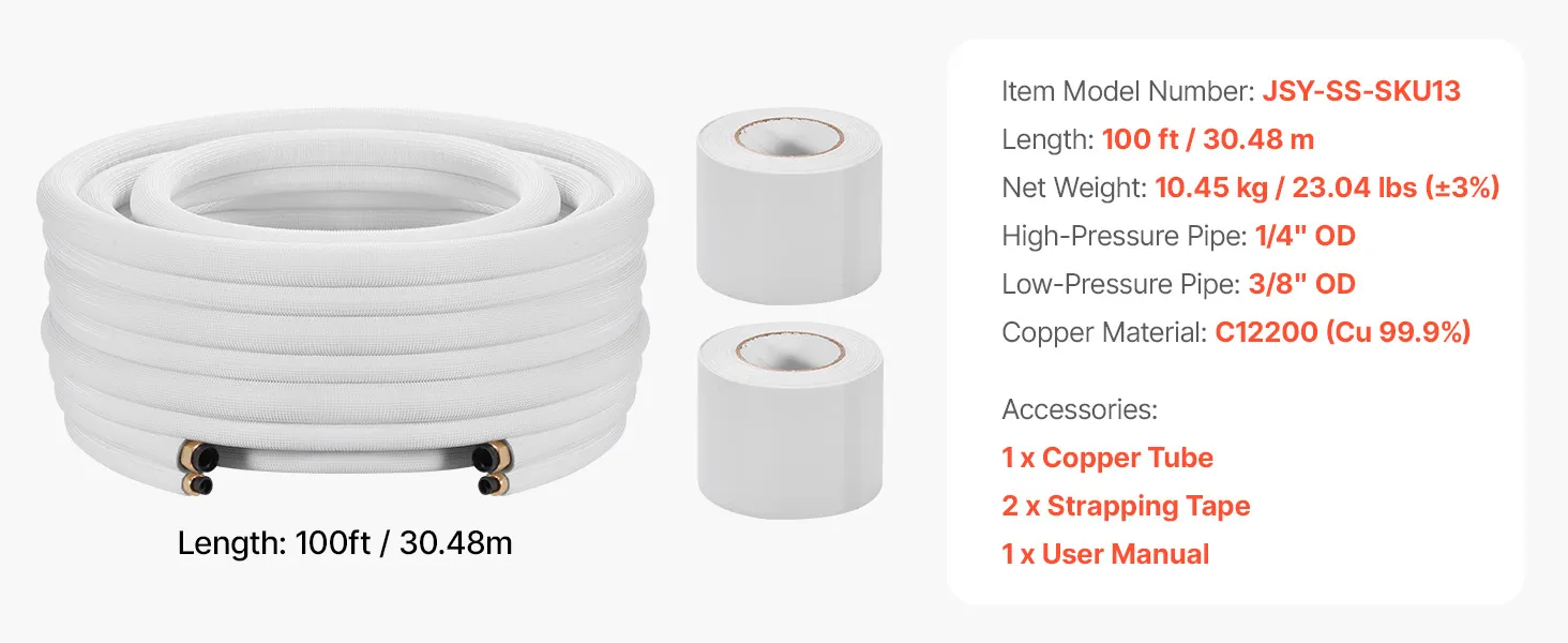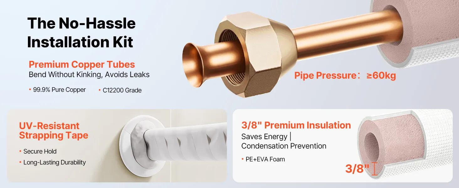 The kit is compatible with mini-split AC units. High-purity tubing resists kinking and leaks during bends, ideal for complex setups like garages or workshops. Comes with strapping tape—ready to use out of the box. Simple installation requires only basic tools to connect indoor and outdoor units.