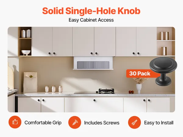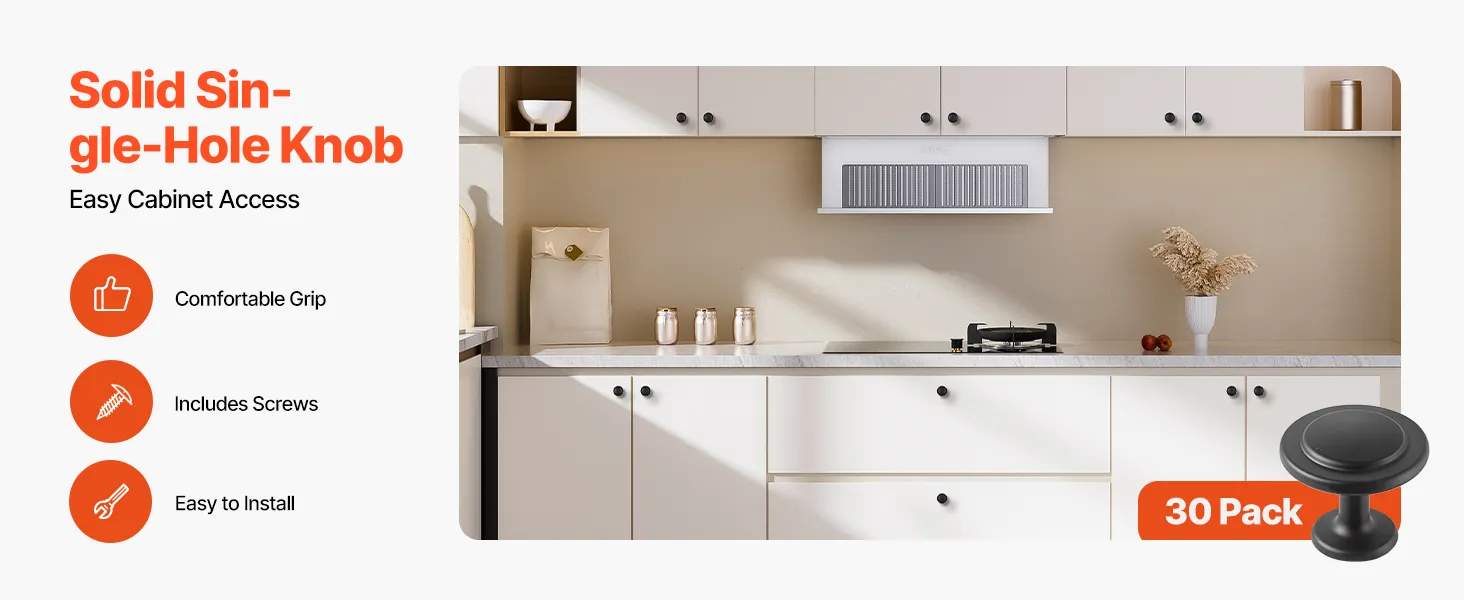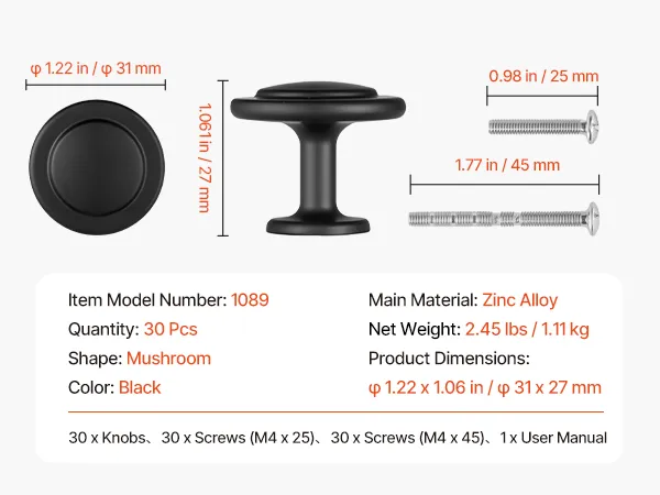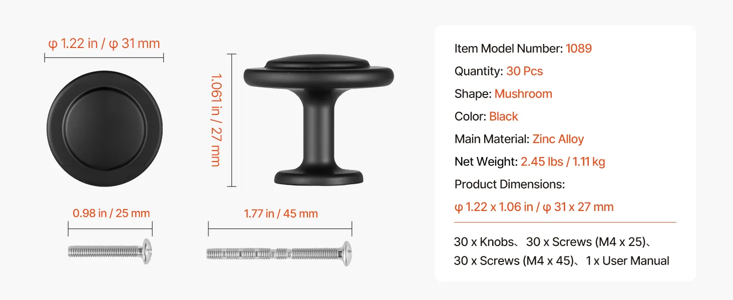 VEVOR Cabinet Knobs, 30 Pack, 31 mm Black Zinc Alloy Drawer Pulls & Door Handles, Mushroom Kitchen Solid Knobs Dresser Handles, Cupboard Hardware with Screws for Bathroom Closet Cabinets and Drawers