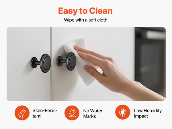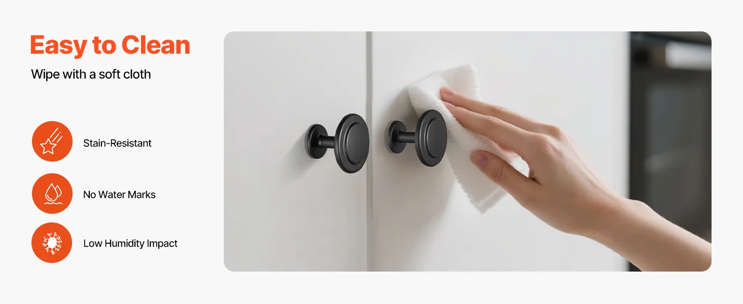 The drawer knob resists stains, water marks, and damp buildup. For daily care, simply wipe clean with a soft cloth. Maintenance is quick and hassle-free.